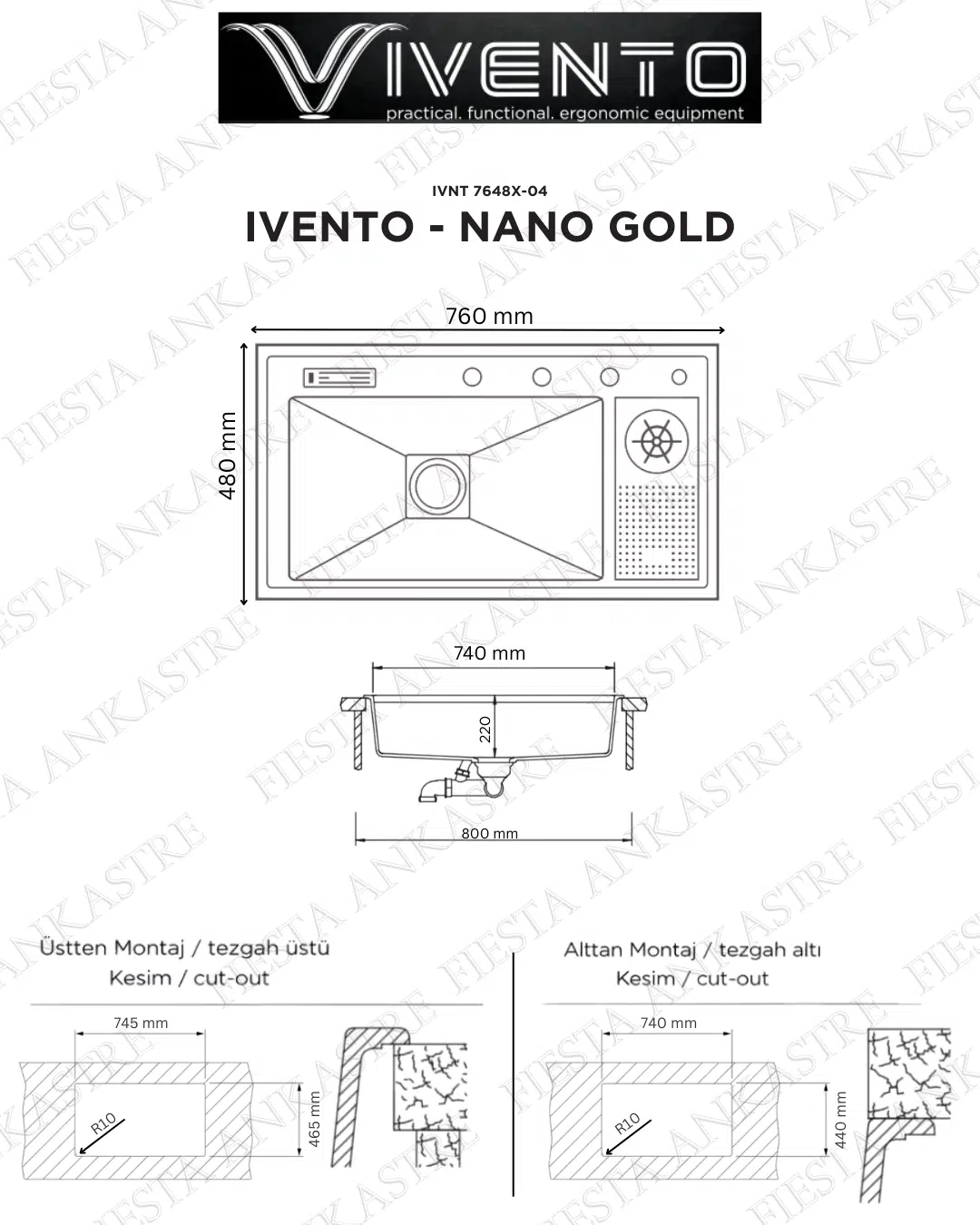 Alttan Montajlı Kesim : 740*440mm R10