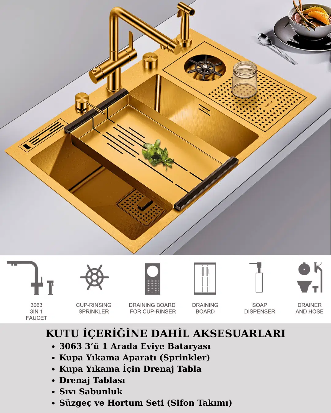 Nano Gold 7648X-04, geniş haznesi ve fonksiyonel aksesuar setiyle mutfakta yıkama, durulama, süzme ve bardak temizleme işlemlerini tek bir alanda toplamak için tasarlanmış premium bir eviyedir. Altın nano kaplama yüzeyi çizilmeye, leke oluşumuna ve su izlerine karşı dayanıklıdır; modern mutfaklara estetik ve hijyen sağlar.